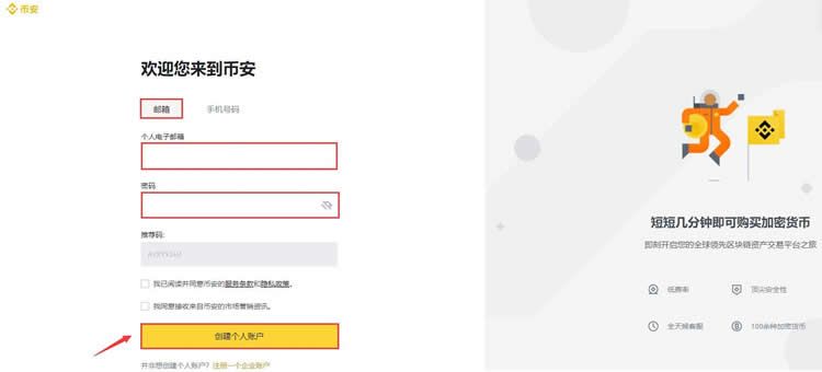 1.打开币安官网,点击【使用手机号或邮箱注册】进入注册页面